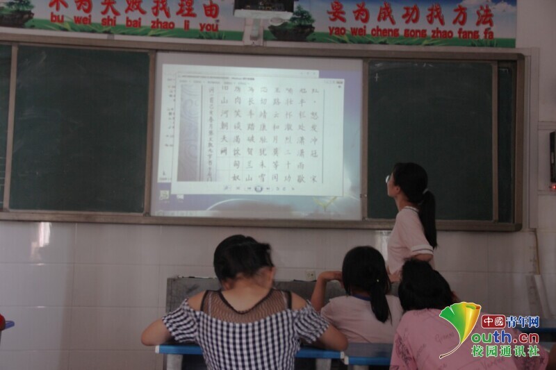 图为团队成员在黑板上为同学纠正笔画写法。中国青年网通讯员 刘琦 摄