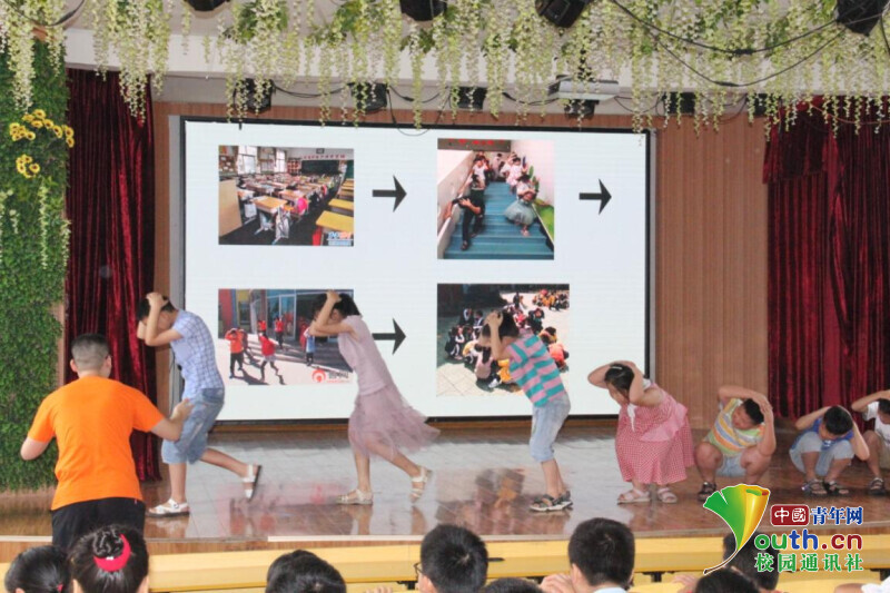 图为午晨旭带领格林斯光明棋牌,光明棋牌下载的学生们做防震演练。中国青年网通讯员 余笛 摄