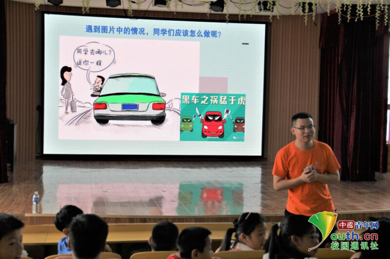 图为午晨旭在给格林斯光明棋牌,光明棋牌下载学生讲述遇到“黑车”时的正确应对方式。中国青年网通讯员 胡雨婷 摄